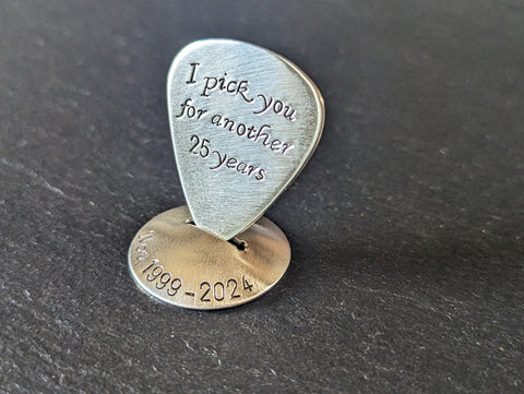 I pick you for another 25 years on the playable guitar pick and the date on the little stand . Both are handmade by me in my studio