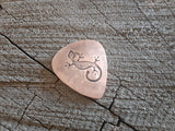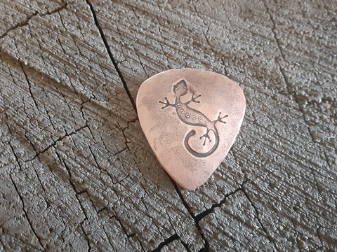 copper guitar pick with lizard